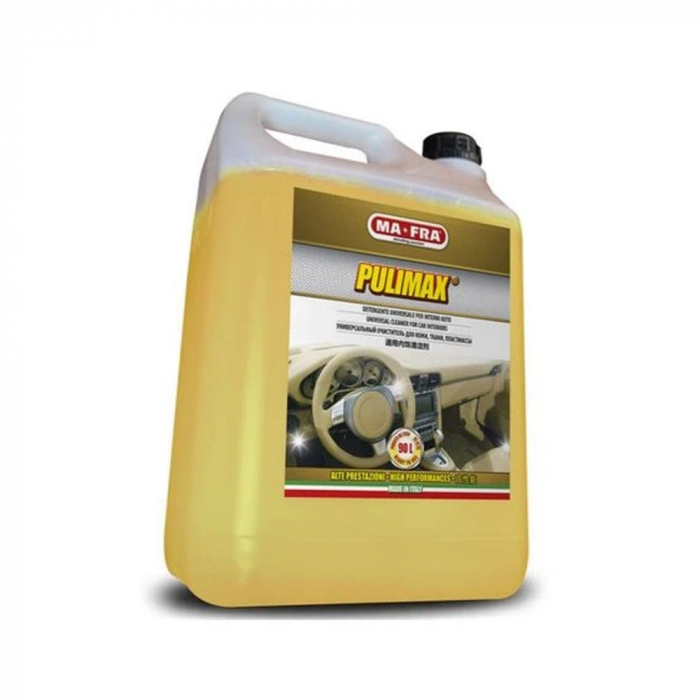 Solutie concentrata curatare interioare Ma-Fra Pulimax Pulimax super concentrat a fost dezvoltat special pentru curatarea tuturor suprafetelor lavabile din habitaclul oricarei masini, cum ar fi: scaune cu tapiterie textila sau scai, toate partile din plastic precum bordul si interiorul usilor, scaune din piele si alte suprafete din piele (cu test prealabil). Pulimax asigura cea mai mare putere de curatare pentru orice fel de murdarie chiar si cu o singura stergere, eliminand murdaria dificila chiar si de pe suprafetele poroase. Domeniu de utilizare: toate suprafetele lavabile din interiorul masinii Instructiuni de utilizare: in functie de gradul de murdarie al suprafetelor curatate, diluati intre 1:10 si 1:15. Pulverizati solutie direct pe suprafete, lasati sa actioneze cateva secunde dupa care indepartati murdaria dizolvata cu o laveta umeda. Clatiti bine suprafetele la final cu o laveta umeda sau cu un aspirator injectie-extractie, insistand pe suprafetele de plastic, altfel putand aparea reziduuri albe. pH: <11,5 Destinat exclusiv utilizatorilor profesionisti!