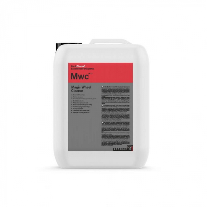 Koch Chemie Mwc Magic Wheel Cleaner este o soluție de curățat jante puternică, vâscoasă, fără acid, cu o performanță inovativă în curățarea ușoară și minuțioasă a jantelor. Componentele reactive din Mwc dizolvă particulele metalice cu un efect de înroșire caracteristic. Dispersanții speciali înlătură de pe suprafață murdăria persistentă. Vâscozitatea special aleasă asigură aderența foarte bună a suprafeței pulverizate pe suprafață. Chiar și în cazul unui timp de reacție mai lung, murdăria rămâne lipită de soluție iar produsul nu se usucă.