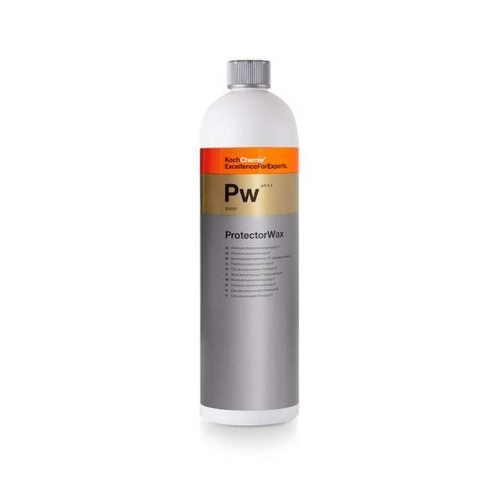 Pw - Protector Wax, ceară auto lichidă spălare, 1 ltr Koch Chemie Pw Protector Wax - Luciu puternic, efect lotus și protecție. Protector Wax este o ceară de conservare inovatoare de înaltă tehnologie care stabilește noi standarde în materie de protecție, durabilitate, luciu extrem de profund, efect lotus pe timp îndelungat (efect hidrofob), performanță în curățarea ușoară și uscare a vehiculelor fără efect de micro perle. Utilizarea componentelor reactive polifuncționale în combinație cu componentele de îngrijire de cea mai înaltă calitate, care aderă ferm la suprafață ca o rețea, garantează o protecție perfectă de lungă durată și cu luciu puternic, precum și vizibilitate îmbunătățită pe timp de ploaie (efect hidrofob de respingere a picăturilor de ploaie). Prin aplicarea regulată se îmbunătățesc luciul și stratul protector, se acoperă zgârieturile fine, iar toate părțile din cauciuc, material plastic precum și textilele de cabriolete vor fi impregnate și de aceea protejate împotriva decolorării și a deteriorării (fragilității). De aceea ProtectorWax are o contribuție semnificativă în menținerea valorii vehiculului. Poate fi utilizat ca ceară rece, fierbinte și ca spumă (mecanic sau manual). Obține rezultate optime de uscare chiar și cu valori ridicate de conductivitate ale apei utilizate, precum și cu unghiuri dificile ale geometriei suflantei. Parfumuri speciale îi conferă un miros fructat. Este optim compatibil cu instalațiile biologice de tratare a apelor uzate. Nu conține hidrocarburi petroliere. Conform cu VDA clasa A.