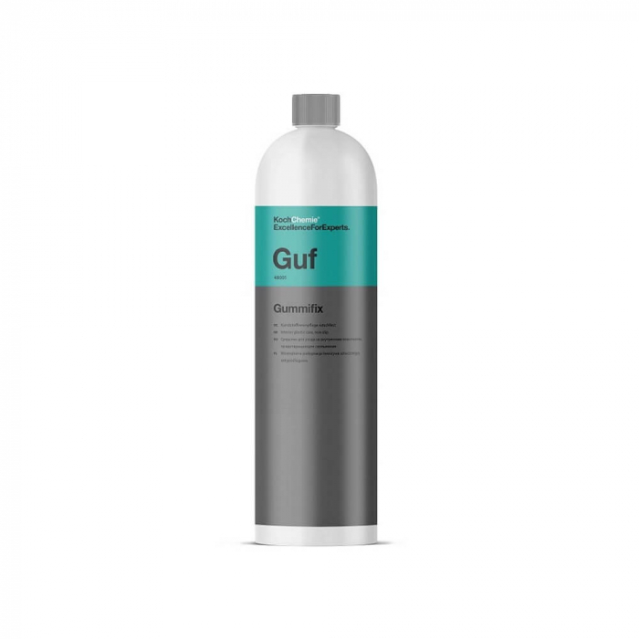 Koch Chemie Guf Gummifix este o soluție pentru întreținere suprafețe plastic la interior. Guf Gummifix este o soluție fără uleiuri și silicon, ne-grasă, pentru îngrijirea suprafețelor din cauciuc și plastic cum ar fi: covorașe de cauciuc, pardoseli din plastic și alte zone interioare ale autoturismelor, vehiculelor comerciale, unde rezistența la alunecare este necesară. Guf Oferă suprafețelor tratate un aspect de nou.