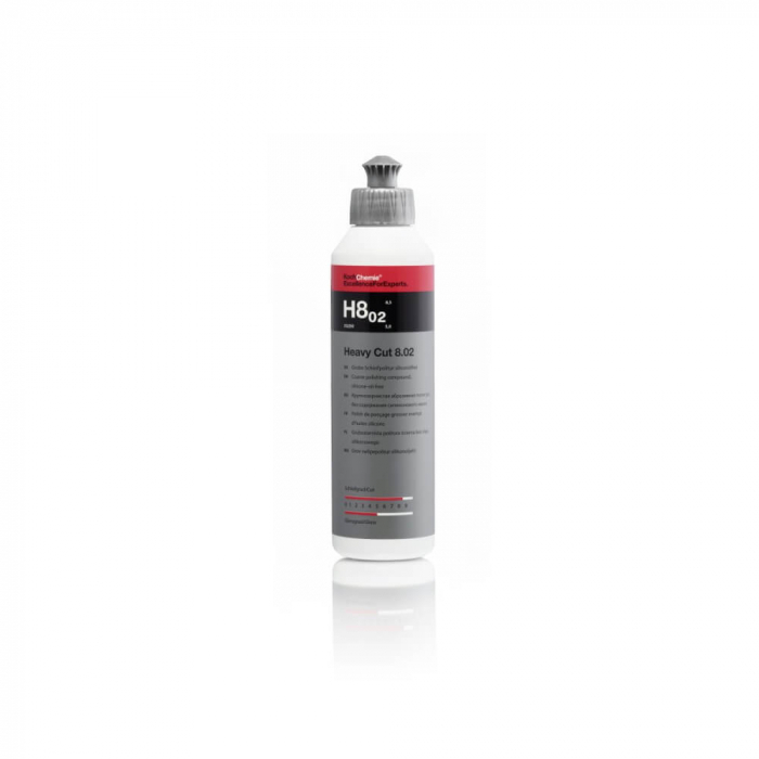 Koch Chemie H8.02 Heavy Cut este un compus (compound) pentru lustruire (polisare) grosieră, fără uleiuri și silicon. Heavy Cut este un polish (compound) inovativ pentru aplicare mecanică pentru reparația rapidă a vopselelor deteriorate, eliminarea zgârieturilor adânci și îndepărtarea eficientă a gazării și a urmelor de șlefuire cu granulație de până la 1.500. Datorită amestecului omogen de granule abrazive, H8.02 atinge un nivel ridicat de tăiere cu un nivel excelent de luciu. Poate fi lucrat pentru o perioadă prelungită fără să devină lipicios și are o formare redusă a prafului. Ideal pentru toate tipurile de vopsea (atât moi cât și rezistente la zgârieturi). Cu aprobare Daimler.