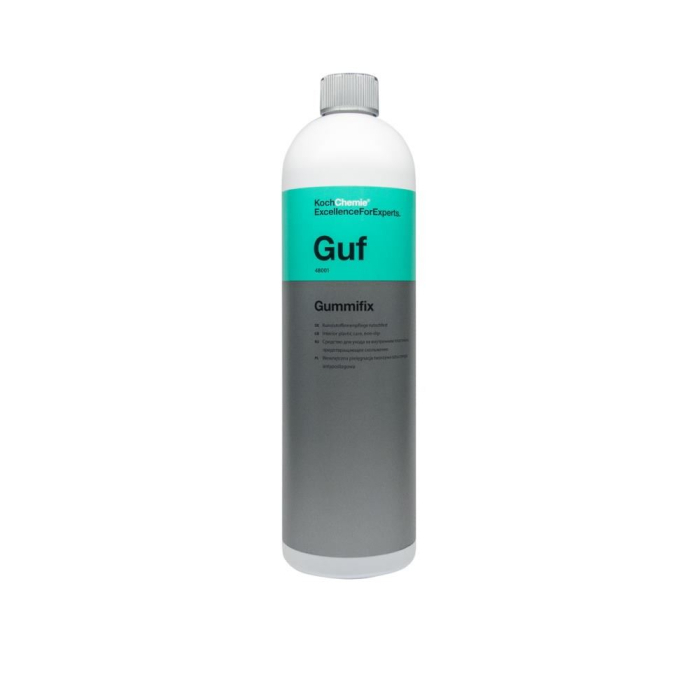 Bord | Plastice Interioare interior nealunecos Koch Chemie Gummifix, Guf, 1L Bord | Plastice Interioare interior nealunecos Gummifix, Guf, este o solutie fara uleiuri si silicon, ne-grasa, pentru ingrijirea suprafetelor din cauciuc si plastic cum ar fi: covorase de cauciuc, pardoseli din plastic si alte zone interioare ale autoturismelor, vehiculelor comerciale, unde rezistenta la alunecare este necesara. Dressingul Gummifix, Guf, ofera suprafetelor tratate un aspect de nou. Domeniu de utilizare: suprafete din cauciuc si plastic cum ar fi: covorase de cauciuc, pardoseli din plastic, etc.Indicatii de utilizare: aplicati uniform pe suprafata in prealabil curatata si uscata cu ajutorul unui aplicator sau prin pulverizare. Lasati sa se usuce. Stergeti cu o laveta excesul daca este necesar.