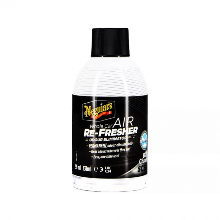 Odorizant auto Meguiar's Whole Car Air Refresher Odor Eliminator Mist Black Chrome Scent, 331ml Odorizantul auto Whole Car Air Refresher Odor Eliminator Mist Black Chrome Scent inlatura mirosuri neplacute precum cel de caine ud, fumat, haine de gimnastica, etc. Masina ta si-a pierdut mirosul de proaspat? Acum te poti bucura de un miros proaspat de masina noua de fiecare data cand intri in ea. Tehnologia avansata Meguiars Re-Fresher nu doar inlatura permanent mirosurile neplacute de peste tot de unde le gaseste, ci le si inlocuieste cu un miros placut ce dureaza saptamani. Meguiars Whole Car Air Re-Fresher penetreaza intreg habitaclul trecand prin sistemul de ventilatie, apoi de-a lungul plafonului si prin toate zonele greu accesibile. Tehnologia Re-Fresher inlatura permanent mirosurile prin legaturi chimice la nivel molecular. Indicatii de utilizare: in habitaclul in prealabil curatat de sursele de miros si uscat, asezati doza de spray intr-un punct central, nu departe de sursele de ventilatie, porniti sistemul de ventilatie si comutati pe recirculare, aer rece si viteza maxima, dupa care actionati spray-ul si inchideti portiera, lasand sprayul sa se goleasca si sa actioneze circa 15-20 min. Dupa trecerea acestui interval, opriti motorul si lasati usile deschise pentru o ventilatie naturala pentru alte 10-15 minute.