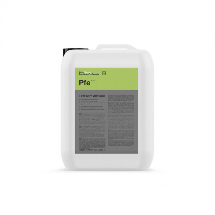 Spuma prespalare si inlaturare insecte Koch Chemie PreFoam Efficient, Pfe PreFoam Efficient, Pfe, este o soluție de prespalare rapida, puternic concentrata, fara fosfati, puternic alcalina, pentru prespalarea autoturismelor si camioanelor. Combinația dintre agenți formatori de inalta calitate si agenți tensioactivi dizolva extrem de rapid chiar si cele mai persistente murdarii cum ar fi: insecte, excremente de pasare, factori poluanţi si murdaria de pe jante, fiind de aceea ideala pentru spalatoriile de masini cu timpi scurți de reacție (de exemplu sisteme de spalare expres). Formarea puternica de spuma in combinatie cu mirosil placut de citrice ofera o senzatie placuta de spalare. Domeniu de utilizare: autoturisme, vehicule comerciale, utilaje de construcții, etcIndicații de utilizare: in functie de acumularile de mizerieCuratare insecte: 1:20Prespalare: 1:30Prespalare camioane: 1:15 pana la 1:20Aplicati pe intreaga suprafata de jos in sus, lasati sa acționeze maxim 1 minut si clatiți bine folosind un aparat de spalat cu presiune.VDA conform clasei B.pH: 13,5* Destinat exclusiv utilizatorilor profesionisti!