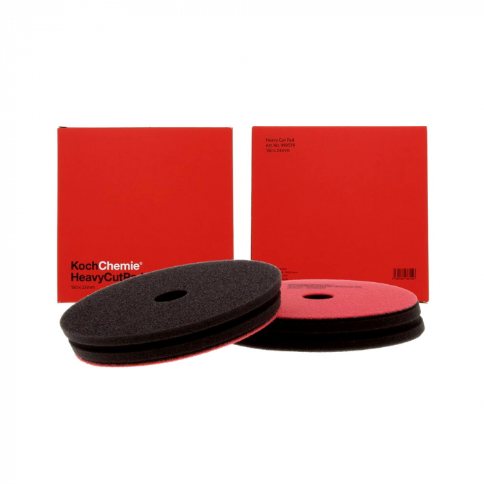 Koch Chemie Heavy Cut Pad este un burete abraziv pentru îndepărtarea stratului de vopsea îmbătrânită și a zgârieturilor adânci folosind Heavy Cut H9.01. înălțimea redusă a Heavy Cut Pad, de numai 23 mm. creează forțe de torsiune scăzute, manevrabilitate foarte bună și cel mai înalt nivel de stabilitate. Densitatea specială a materialului din spumă permite o fermitate și o compresie stabilă de lungă durată duritate în timpul lustruirii. Reticularea optimă (structura celulară deschisă) și numărul celulelor contribuie la un finisaj cu strălucire puternică și factori de igienă foarte buni. Marginea frezată asigură o flexibilitate suplimentară buretelui, permițând să se potrivească mai ușor în jurul contururilor. Materialul velcro nețesut colorat, potrivit pentru lustruire, asigură siguranța procesului. Rezistență la comprimare: 17. Abrazivitate: 9