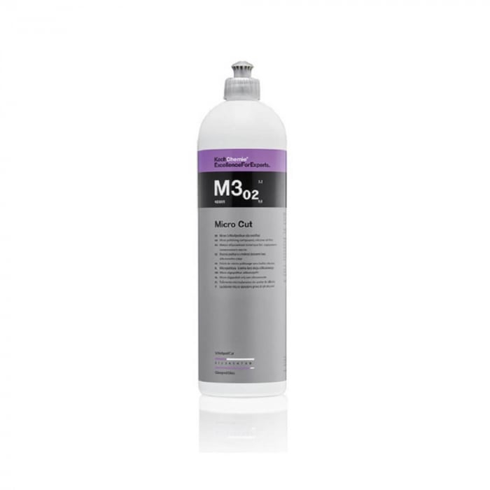 Koch Chemie Micro Cut M3.02 este ultima generație de micro polish (micro compound) pentru îndepărtarea permanentă prin aplicare mecanică a hologramelor, zgârieturilor fine, dungilor și a urmelor de șlefuire cu granulație de până la 3.000 pe toate tipurile de vopsea (inclusiv rezistente la zgârieturi). Prin utilizarea unor compuși abrazivi specializați și extrem de omogeni, se creează un luciu strălucitor permanent în condiții de lumină extremă chiar și pe culori închise și în nuanțe sensibile. Hologramele și zgârieturile fine sunt eliminate mecanic și nu acoperite, ca în majoritatea cazurilor. Micro Cut M3.02 este extrem de economic, ușor de lustruit (polișat) și ușor de înlăturat fără să lase urme.