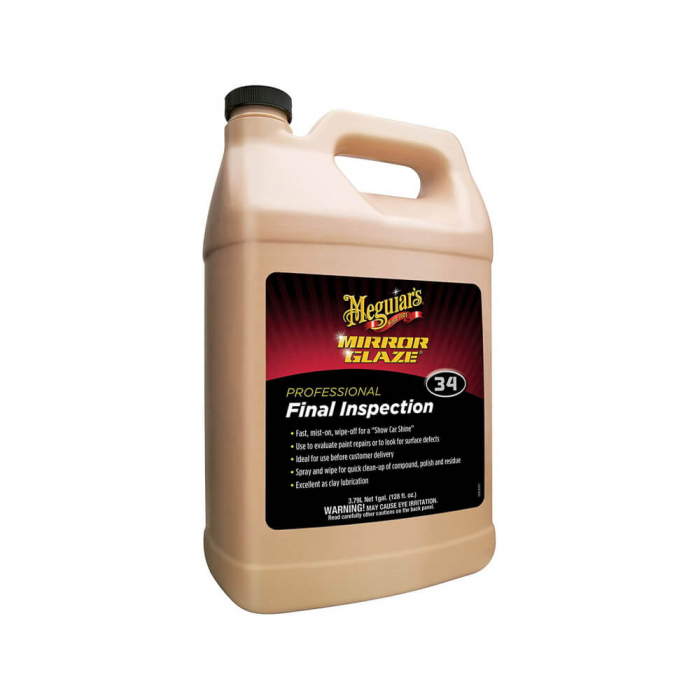 Meguiars Final Inspection M34 este o formulă ușor de utilizat de tip pulverizează și șterge, care elimină în siguranță contaminanți ușori și proaspeți, menținând o strălucire . Final Inspection M34, fiind o soluție sigură pentru utilizarea în vopsitorii, este perfect pentru curățarea rapidă a reziduurilor de polish, pentru evaluarea reparațiilor de vopsitorie, când căutați defecte ale suprafeței sau ca o soluție finală pentru ștergere. Este sigur și eficient pe toate tipurile de vopsea, inclusiv pe lacuri incolore. Se poate utiliza excelent ca și lubrifiant pentru argilele Meguiar's Detailing Clay Mild - C2000 și Aggressive - C2100. Este de asemenea un produs perfect pentru ștergerea prafului și a amprentelor de pe mașinile dintr-un showroom, de pe orice tip de suprafață.