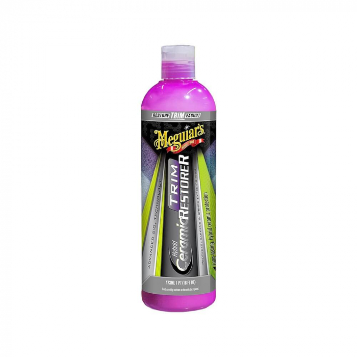 Bord | Plastice Interioare exterior Meguiar's Hybrid Ceramic Trim Restorer, 473mlMeguiar's Hybrid Ceramic Trim Restorer reinnoieste, revigoreaza si protejeaza ornamentele auto exterioare nevopsite, rapid si usor. Folosind tehnologia avansata SiO2 pentru a crea un aspect de nou pe ornamentele exterioare ale masinii, care rezista spalarii, ploii si intemperiilor. Hybrid Ceramic Trim Restorer ofera o noua viata tuturor ornamentelor exterioare nevopsite din plastic, vinil si cauciuc, cum ar fi piesele ornamentale, trimuri, manerele usilor, barele de protectie, carcasele oglinzilor si chederele parbrizului. Domeniu de utilizare: ornamente exterioare nevopsite cum ar fi piesele ornamentale, trimuri, manerele usilor, barele de protectie, carcasele oglinzilor si chederele parbrizului. Indicatii de utilizare: pe suprafata in prealabil spalata si uscata, cu ajutorul unui aplicator WA1000 intindeti o cantitate mica in strat subtire si uniform, asteptati 5-10 minute dupa care stergeti excesul cu o laveta curata din microfibre si gata!