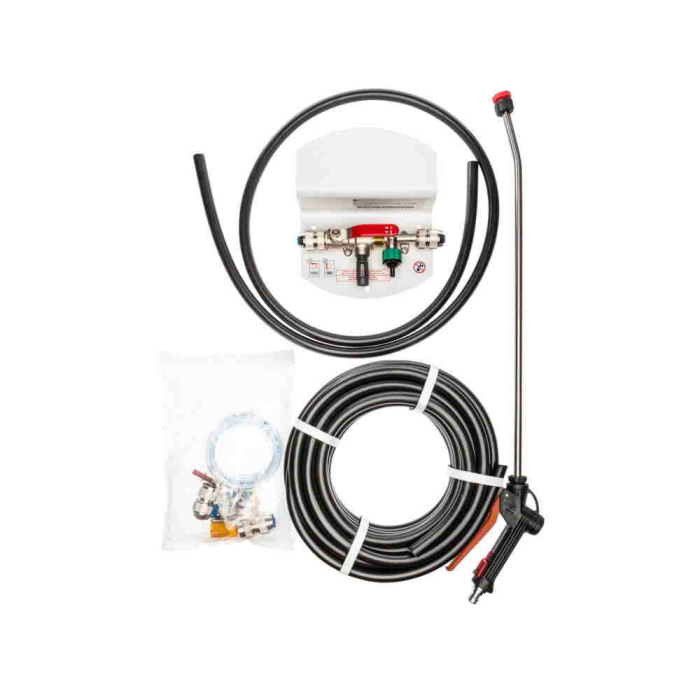 Sistem pulverizare si dozare solutii, set cu 15m furtun si lance presiune redusa, Koch Chemie Koch Chemie ofera un sistem pulverizare si dozare solutii, cu prindere pe perete, cu 15m furtun si lance presiune redusa. Sistemul de pulverizare si dozare solutii este conectat direct la reteaua de apa curenta si dilueaza automat si sigur agentii de curatare alcalini (cum ar fi cei pentru pre-spalare) cu apa. Lancea de presiune redusa are 60 cm lungime si este dotata cu un cap de pulverizare pentru jet plat. Sistemul functioneaza cu apa cu o presiune minima de 2 bar si maxima de 6 bar. Furtunul este prevazut cu un sistem de cupla rapida care permite conectarea rapida a lancei. Sunt disponibile 16 dozaje diferite, intre 0,5 si 12% (1:200 pana la 1:8,33). Aparatul nu functioneaza cu solutii acide!
