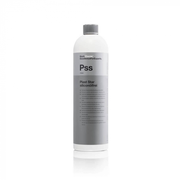 Koch Chemie Pss Plast Star Silicone and Oil Free este produsul Premium fără silicon și uleiuri în domeniul întreținerii și îngrijirii suprafețelor de plastic. Plast Star Silicone and Oil Free menține și protejează suprafețele de-a lungul lunilor, fiind extrem de stabil la UV. Suprafețele tratate cu Pss își recapătă aspectul de nou semi-mat, grație unui sistem special de agenți de îngrijire (micro-emulsii), care aderă ferm la suprafața tratată. Previne înghețarea chederelor. Durata de viață extrem de lungă, utilizarea rapidă și simplă precum și un miros plăcut transformă Plast Star Siliconoelfrei într-un produs imbatabil. Se poate utiliza optim și pe anvelope sau piese din cauciuc. Se poate utiliza în siguranță în ateliere de vopsitorie. Este aprobat Daimler.
